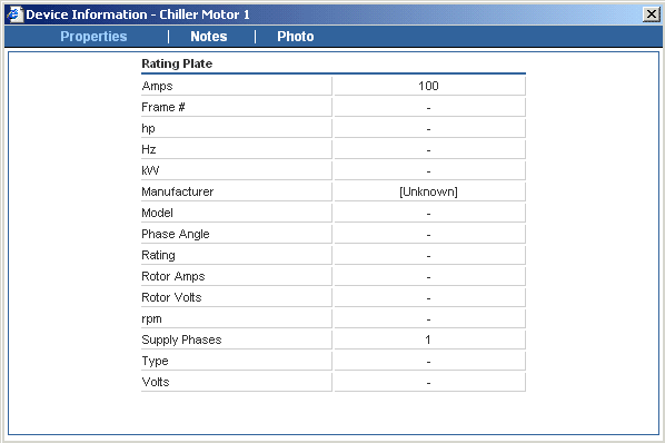 To ensure that you are viewing data form the correct device, Motornostix allows you to store a photograph of each device. This photo can be easily accessed from the Analysis | Mimics page by clicking on the schematic of the device. This presents the Device Information dialog. To view the photo, click the Photo tab.