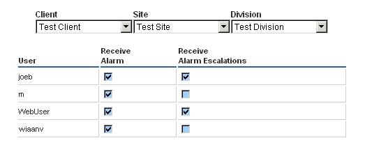 To specify Alarm Escalation receivers, select the check box next to the required users name.